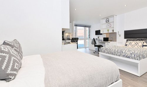 This modern premium studio measures around 22.0-23.3m2 and comes with a large double bed, study area, an ensuite bathroom, a fully fitted kitchen, a smart TV and ample storage. You’ll also enjoy access to the games room and fine dining kitchen.