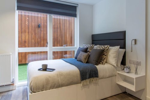 This modern deluxe studio measures around 31.3m2 and comes with a small double bed, study area, an ensuite bathroom, a fully fitted kitchen, a smart TV and ample storage. You’ll also enjoy access to a balcony, games room and a fine dining kitchen.
